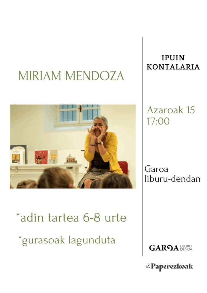 Garoa liburu-dendak antolatuko dituen haurrentzako ipuin-kontalarien saioei Miriam Mendoza zarauztarrak emango dio hasiera. 6-8 urte bitarteko haurrei zuzendua egongo da. Ezinbestekoa izango da, haurra heldu baten ardurapean egotea saioak irauten duen bitartean.